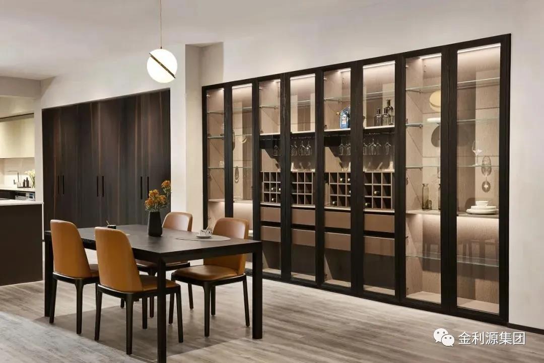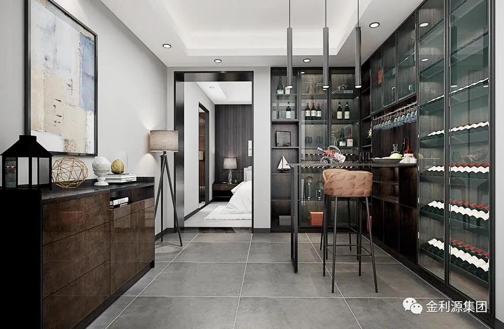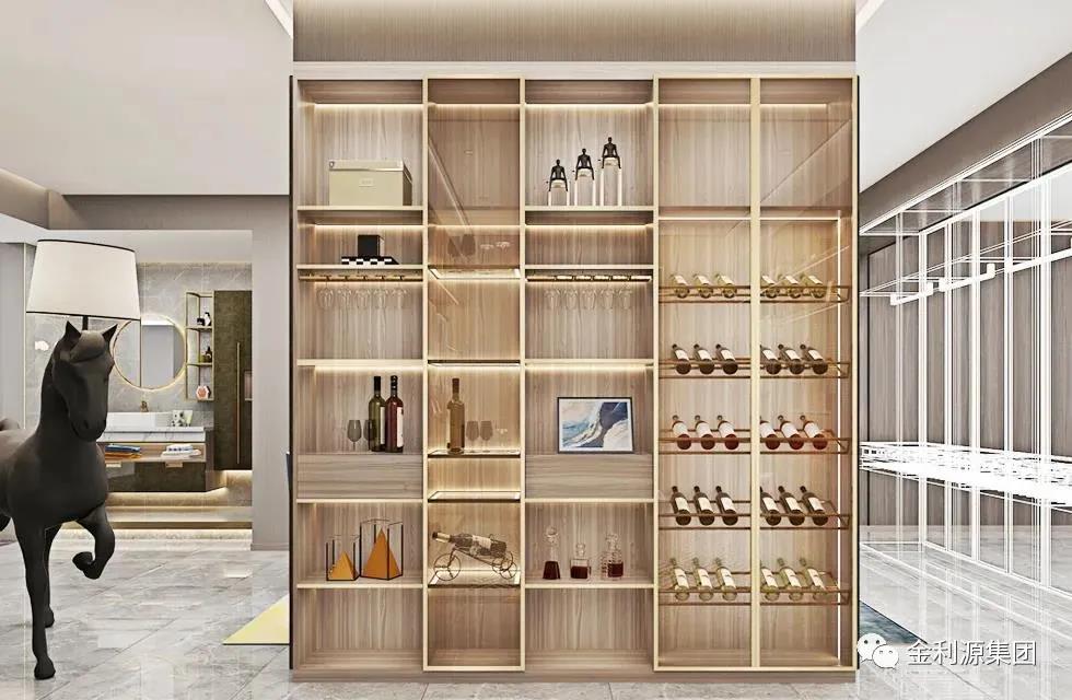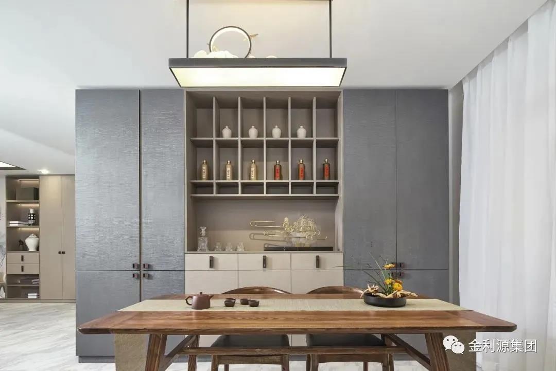 新中式風(fēng)家居如何協(xié)調(diào)不同種類酒的藏與露?采用半開放架+封閉式結(jié)合,外露的開放架仿窗格設(shè)計(jì),將高低尺寸差異化,返璞歸真,更添古韻。