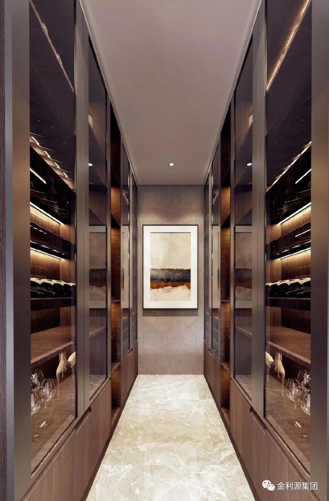 雙一字酒柜布局,打造如酒窖般的儲(chǔ)酒環(huán)境,滿足不同酒類的儲(chǔ)存。玻璃柜門增加空間通透感,集收藏與展示一體,盡顯主人家居品味。