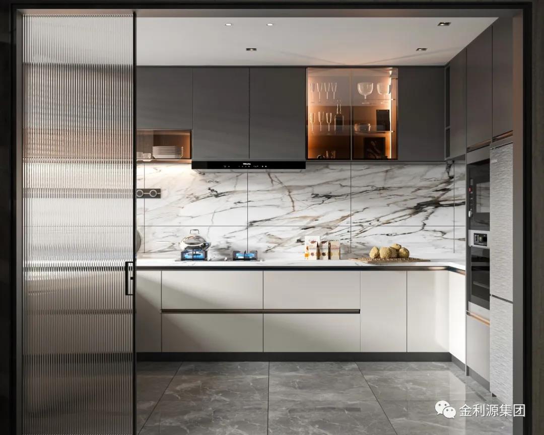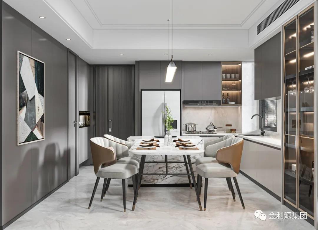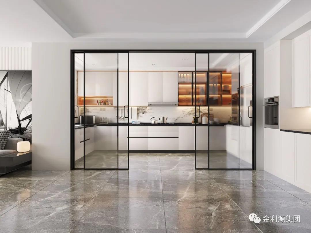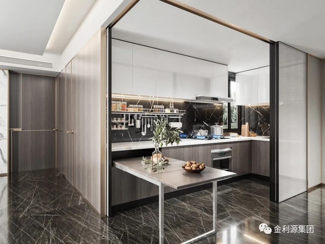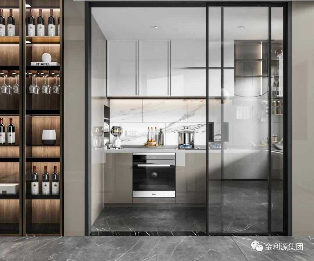 采用玻璃門,或透明推拉門取代實(shí)墻隔斷,餐廚一體,空間透亮,擴(kuò)大視覺延伸感的同時(shí),又可以與家人互動(dòng)。