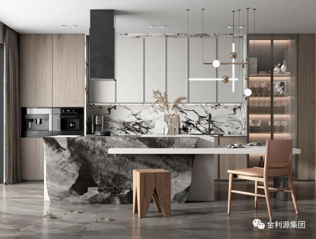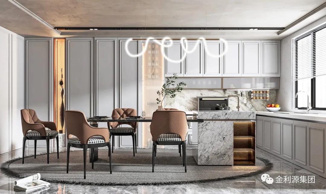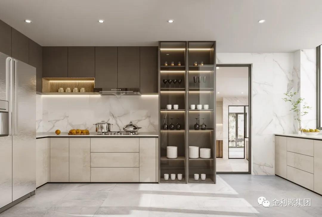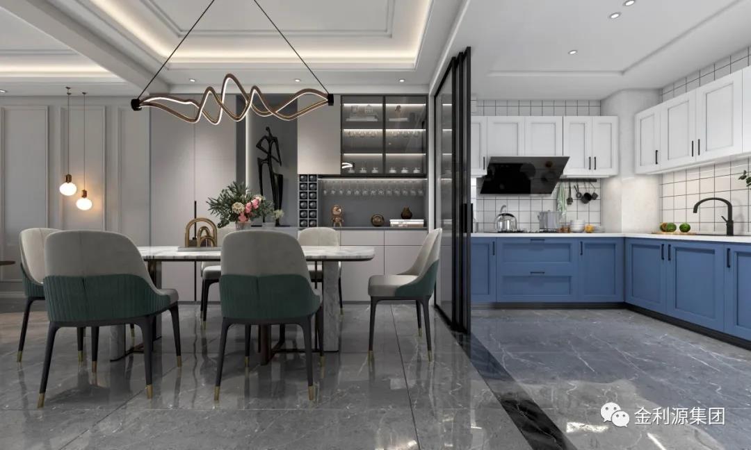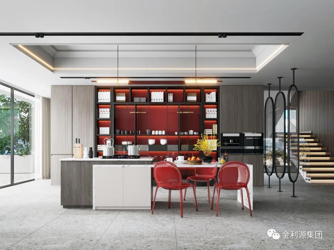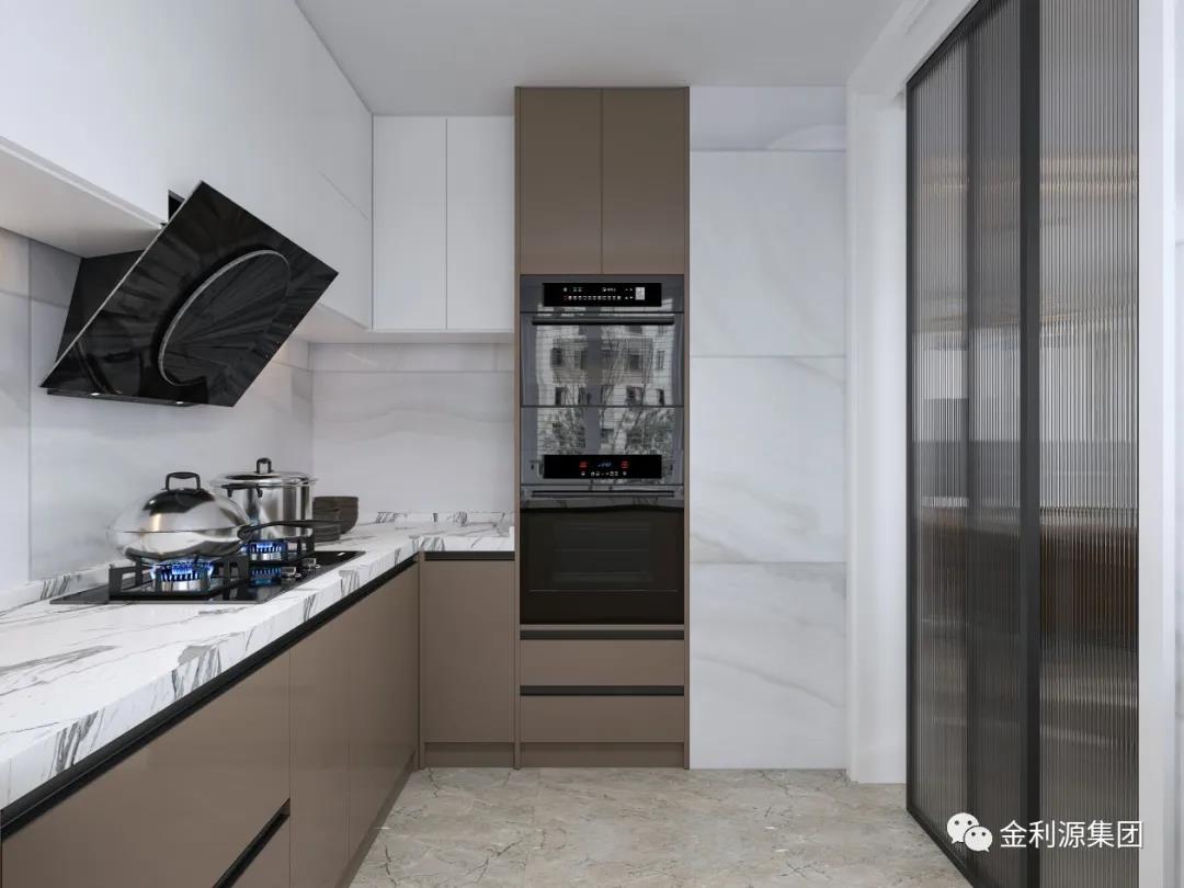 采用玻璃門,或透明推拉門取代實(shí)墻隔斷,餐廚一體,空間透亮,擴(kuò)大視覺延伸感的同時(shí),又可以與家人互動(dòng)。