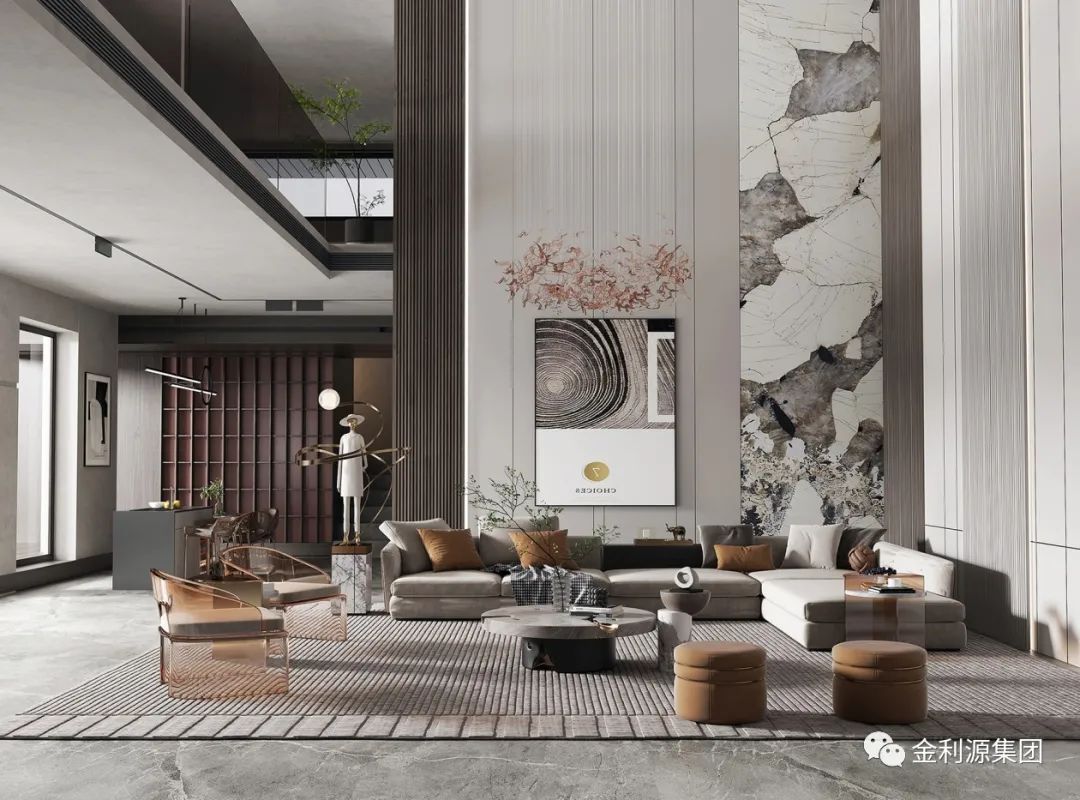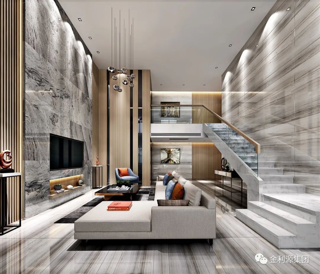 挑空的墻面一般都會設(shè)置一面大大的電視背景墻,這面背景墻一定要做到頂,這樣才能保證空間的整體感和高質(zhì)感。