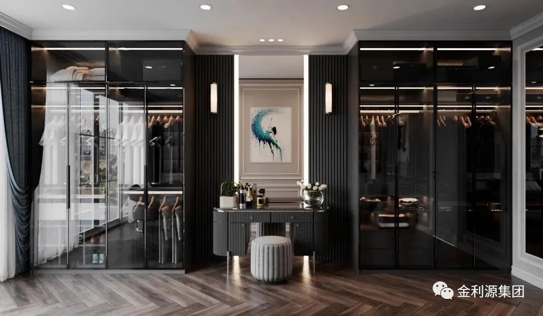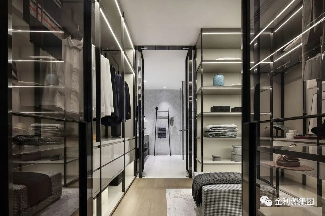 在空間允許下,可利用柜體或玻璃門做隔斷,劃分出一個(gè)衣帽間,這樣不僅不會(huì)浪費(fèi)空間合理使用,還會(huì)在使用上更加便捷,起居動(dòng)線更加合理。