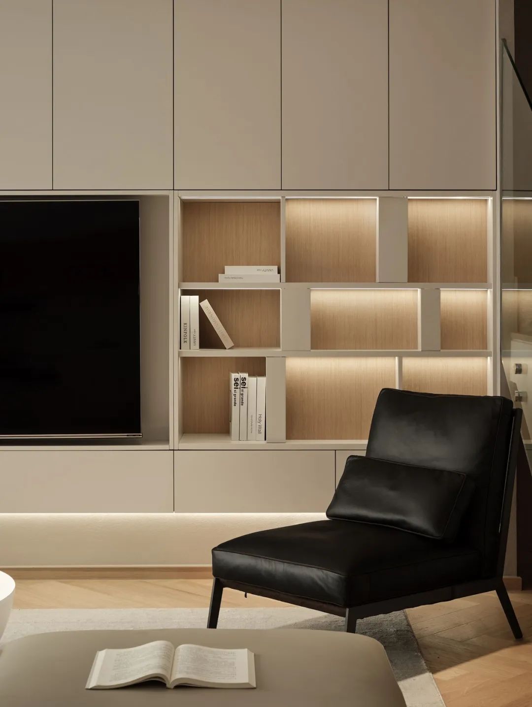 賦予空間敘事更強的光影美感,在體塊合圍之下促成空間的交互,增強了一域多用的可能性,拓展自由感的視覺表達與空間呈現(xiàn)。將科學(xué)性與美學(xué)性融入電視背景墻,展露一重一輕、一簡一繁的設(shè)計思想。