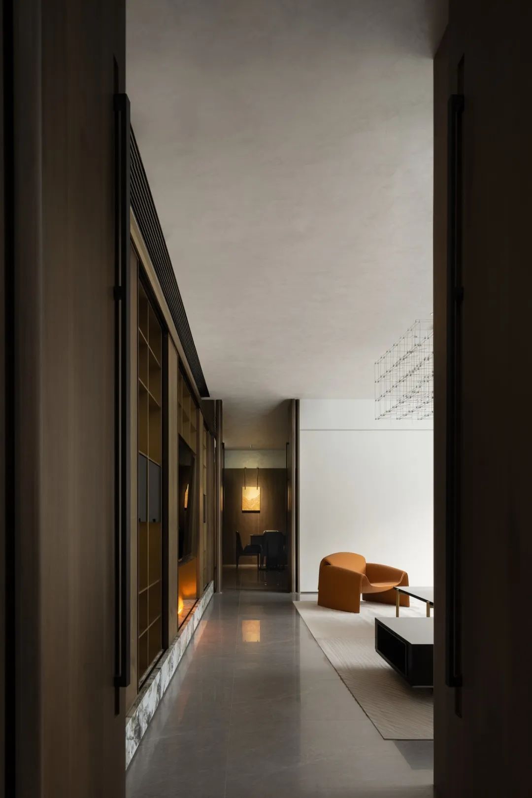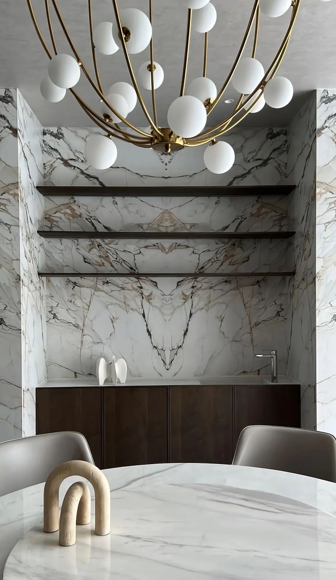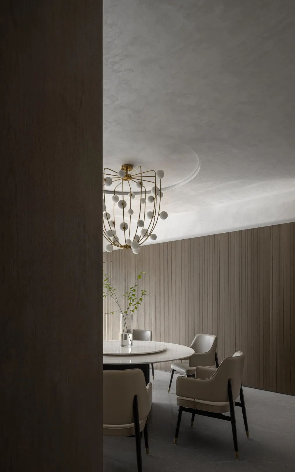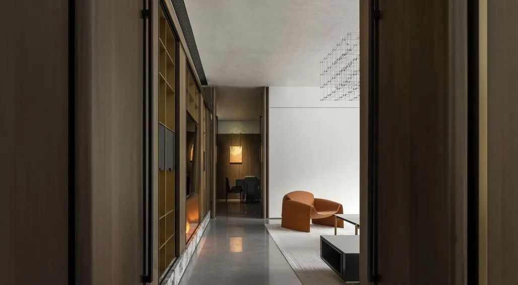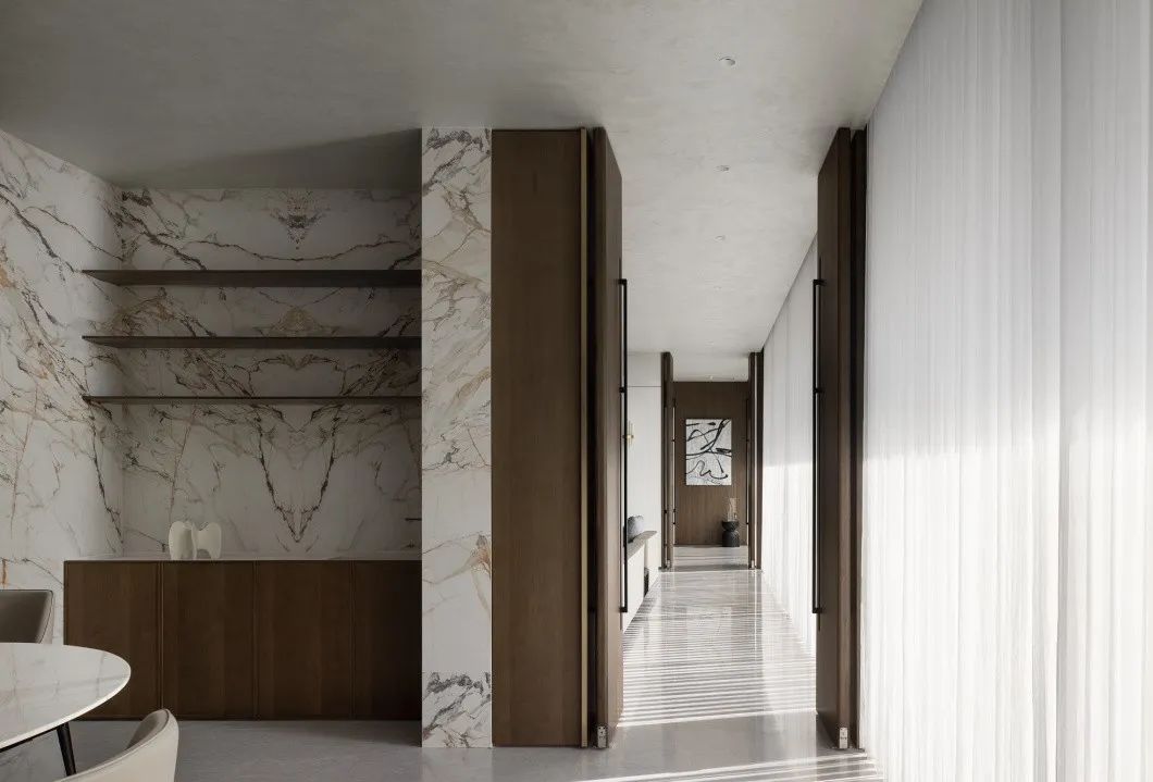 向內(nèi)探尋,空間的再界定變得主次有序、動(dòng)靜相隔。餐廳以圍合、四向的縱深感無(wú)形劃分界限,咫尺之間的意象,花紋大理石墻壁透出若有似無(wú)的邊界,予人流動(dòng)輕盈、詩(shī)意蕩漾的想象。