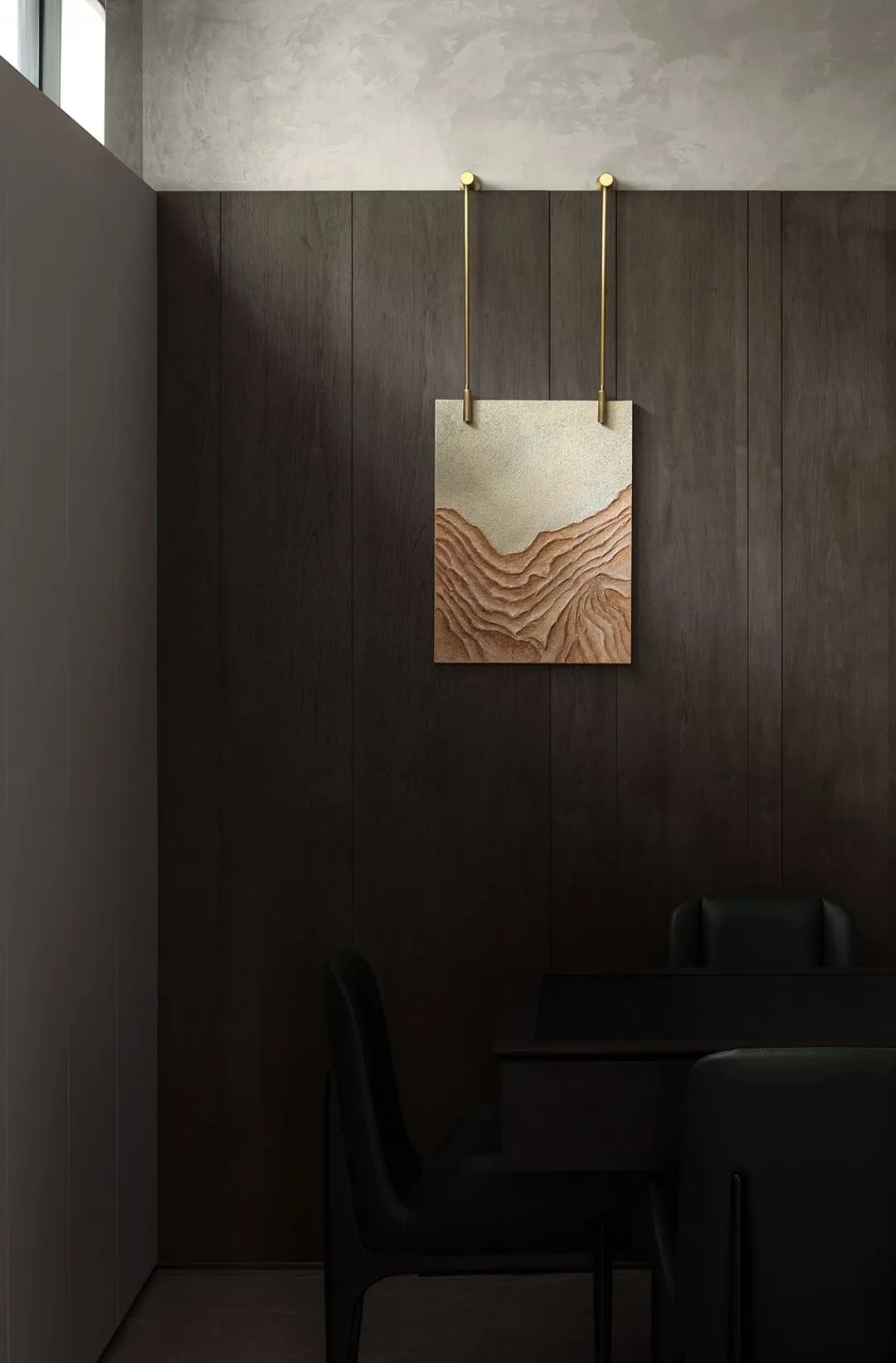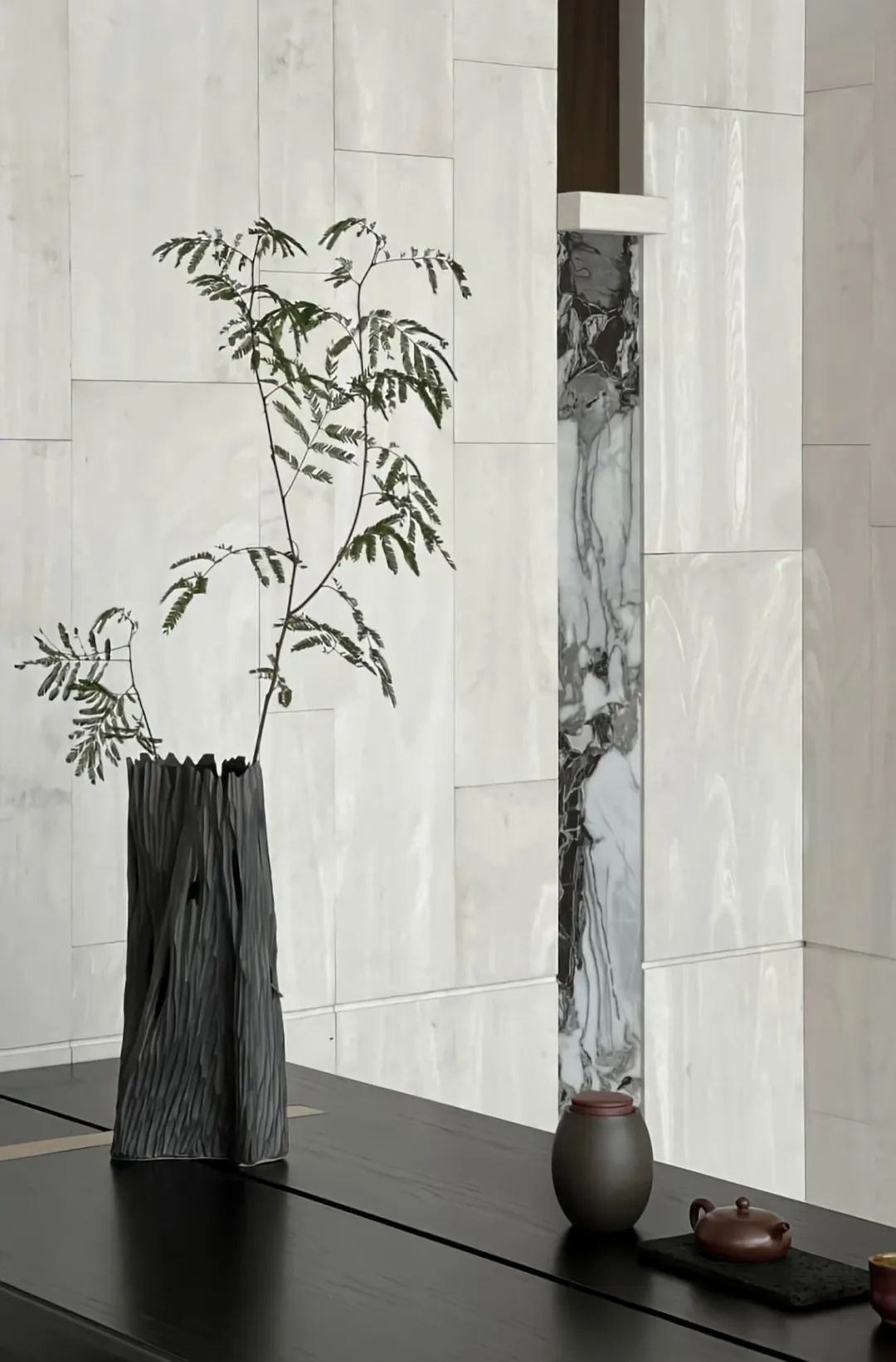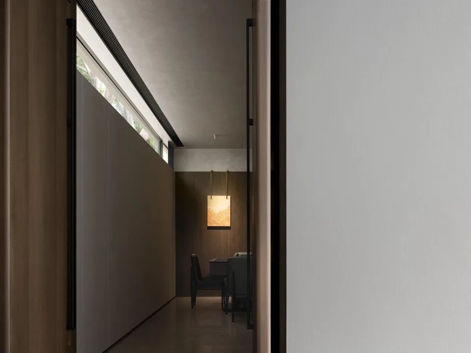 深處,茶室將明朗的優(yōu)雅與質(zhì)樸的素靜奠定空間的基調(diào),一筆凌亂的水墨畫(huà),將空間克制的審美臆想打亂,自然的人文氣質(zhì)瞬間在空間中鋪開(kāi)。