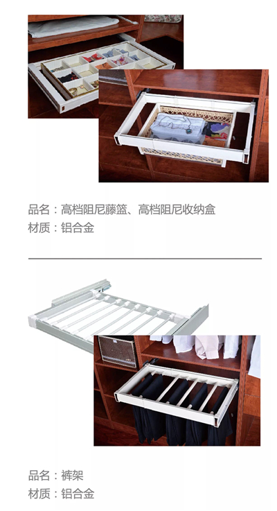 精品鋁合金褲架,高檔阻尼藤籃、收納盒,推拉式試衣鏡、精品阻尼拉籃、保管箱、保險箱等。