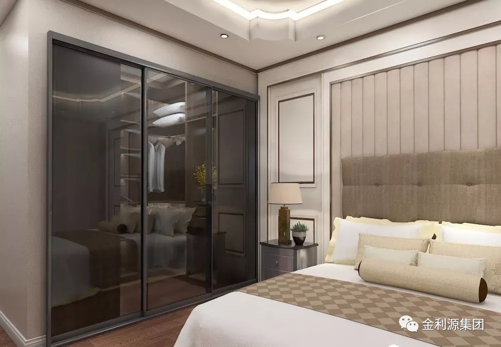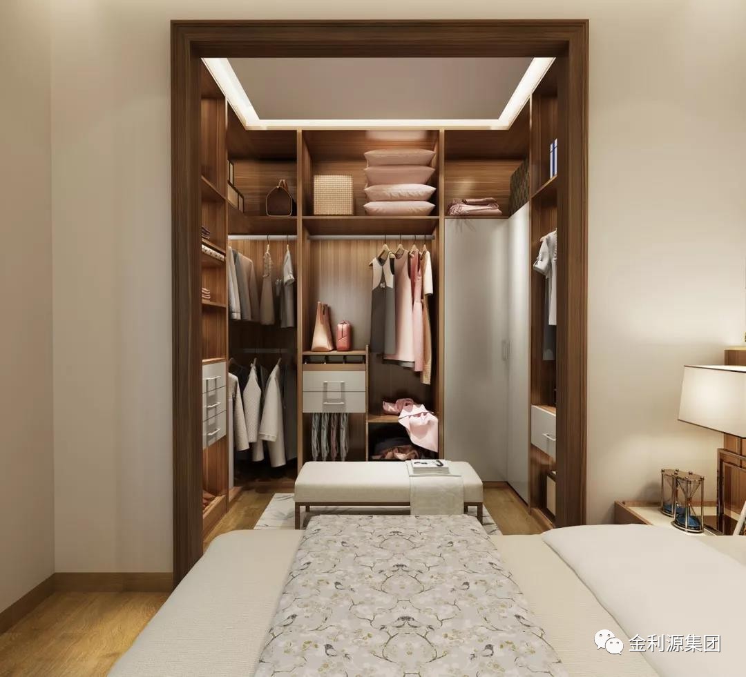 空間小,可以用墻體和衣帽柜圍合成一個(gè)衣帽間,外面用推拉門作為臥室和衣帽間的隔斷,衣帽間內(nèi)采用燈光照明。