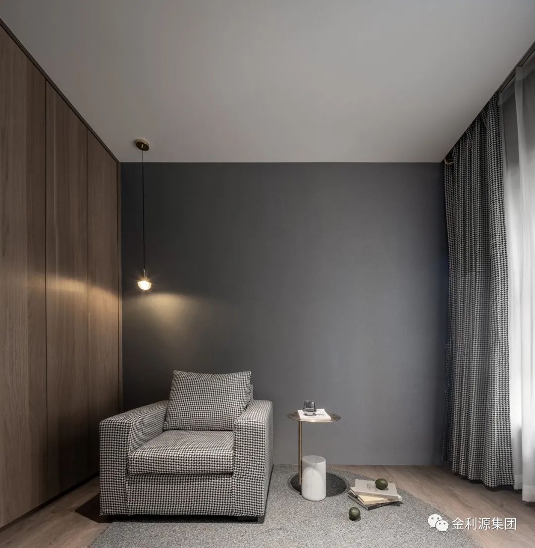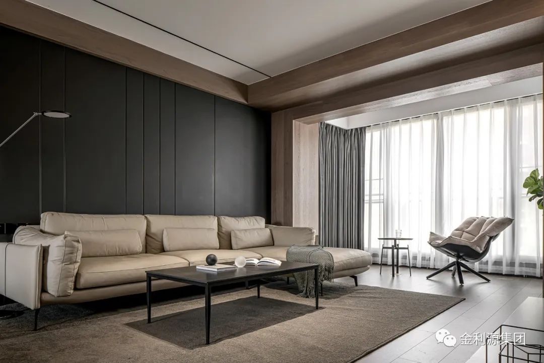 以暖木色鋪陳整體底蘊,勾勒墻體與梁體,為規(guī)整領(lǐng)域架構(gòu)穩(wěn)固根基。黑色手工漆涂抹沙發(fā)硬包背景,呼應(yīng)黑色極簡巖板茶幾,散發(fā)安然氣息。