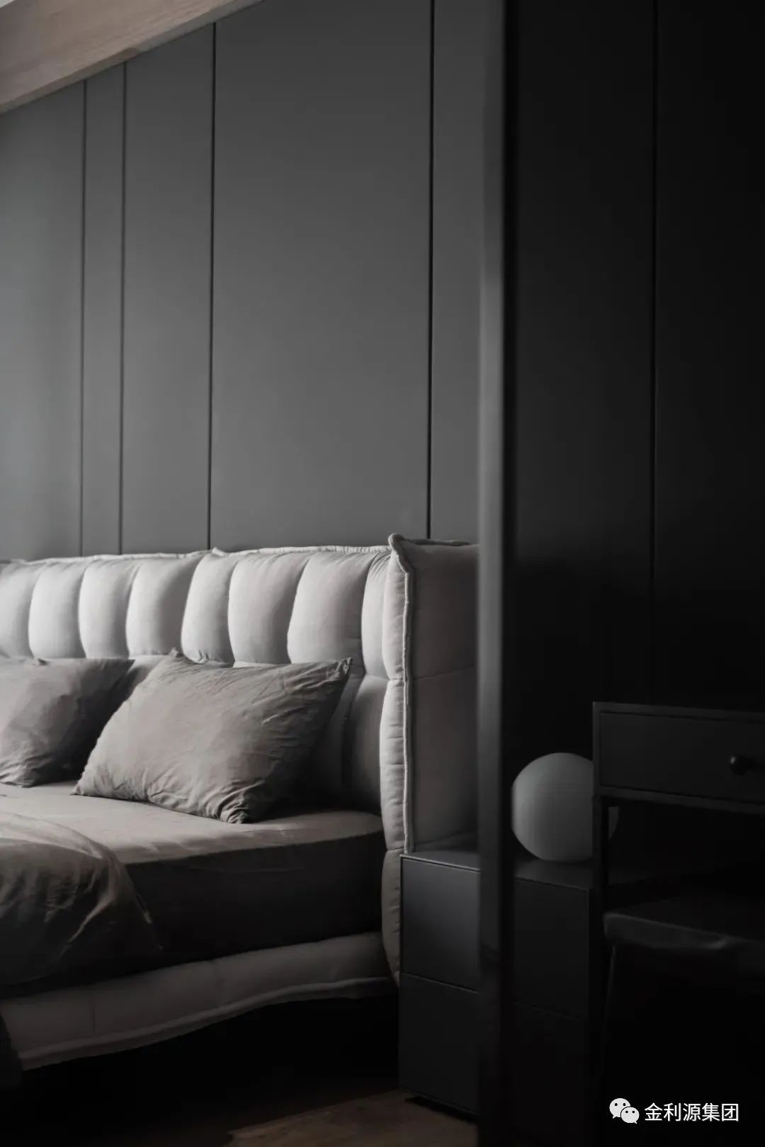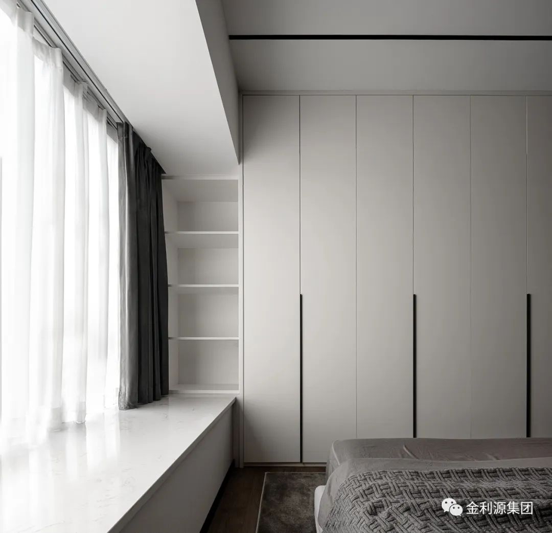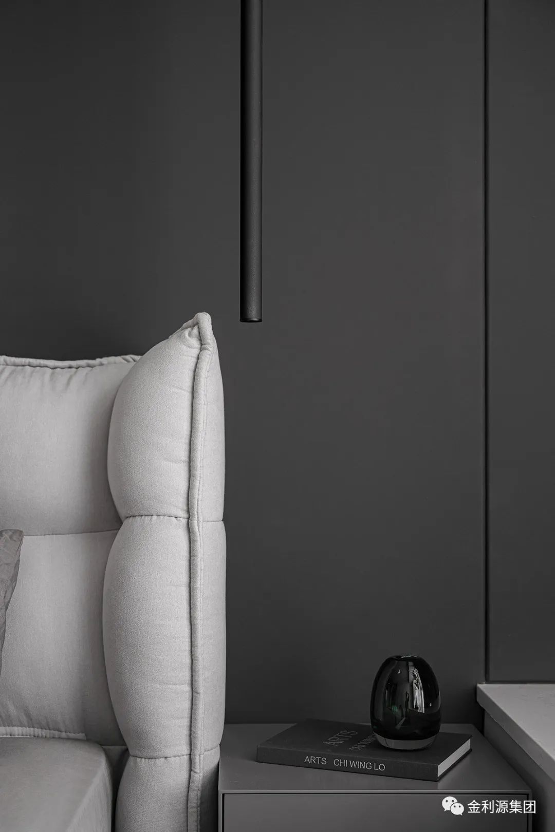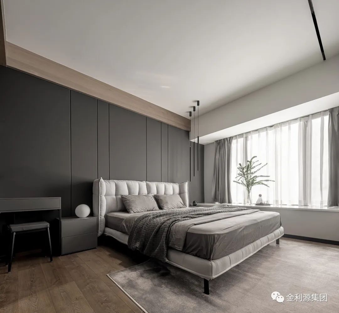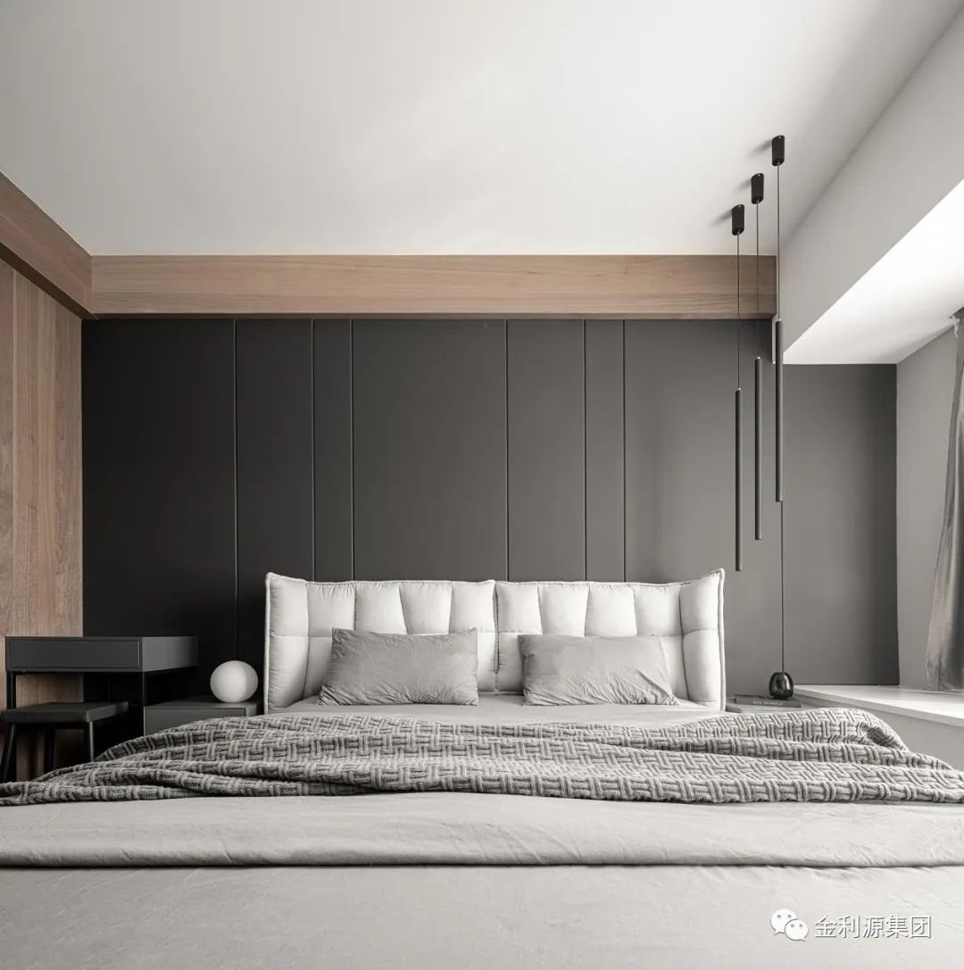 深灰硬包背景對立白色柜體,延續(xù)整體簡潔設(shè)計,以經(jīng)典配色流動功能區(qū)布局…
